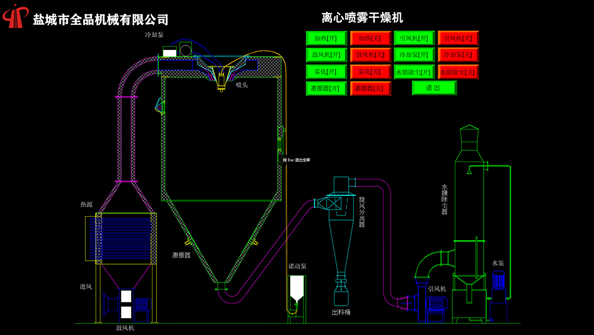 空氣經過過濾和加熱,進入干燥器頂部空氣分配器,熱空氣呈螺旋狀均勻地進入干燥室。料液經塔體頂部的高速離心霧化器(旋轉)噴霧成極細微的霧狀液珠,與熱空氣并流接觸,在極短的時間內可干燥為成品。成品連續地由干燥塔底部和旋風分離器中輸出,廢氣由風機排空。