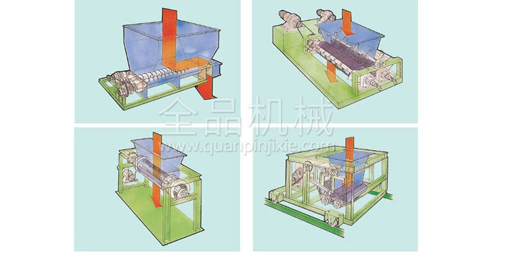 ◎水平擠出成型機: 由加料斗、二根輥子和U形振動網構成。以增大物料的表面積為目的,造粒物料與振動網接觸,由旋轉輥子的強制壓力擠出網外,形成圓柱形的顆粒。