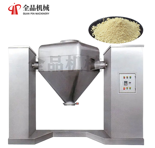 將物料裝入方錐形密閉混合桶內,混合桶對稱的軸線與回轉軸線成一夾角,不同組物料在密閉的混合桶中進行三維空間運動,產生強烈翻轉和擴散收縮作用,達到最佳的混合效果。